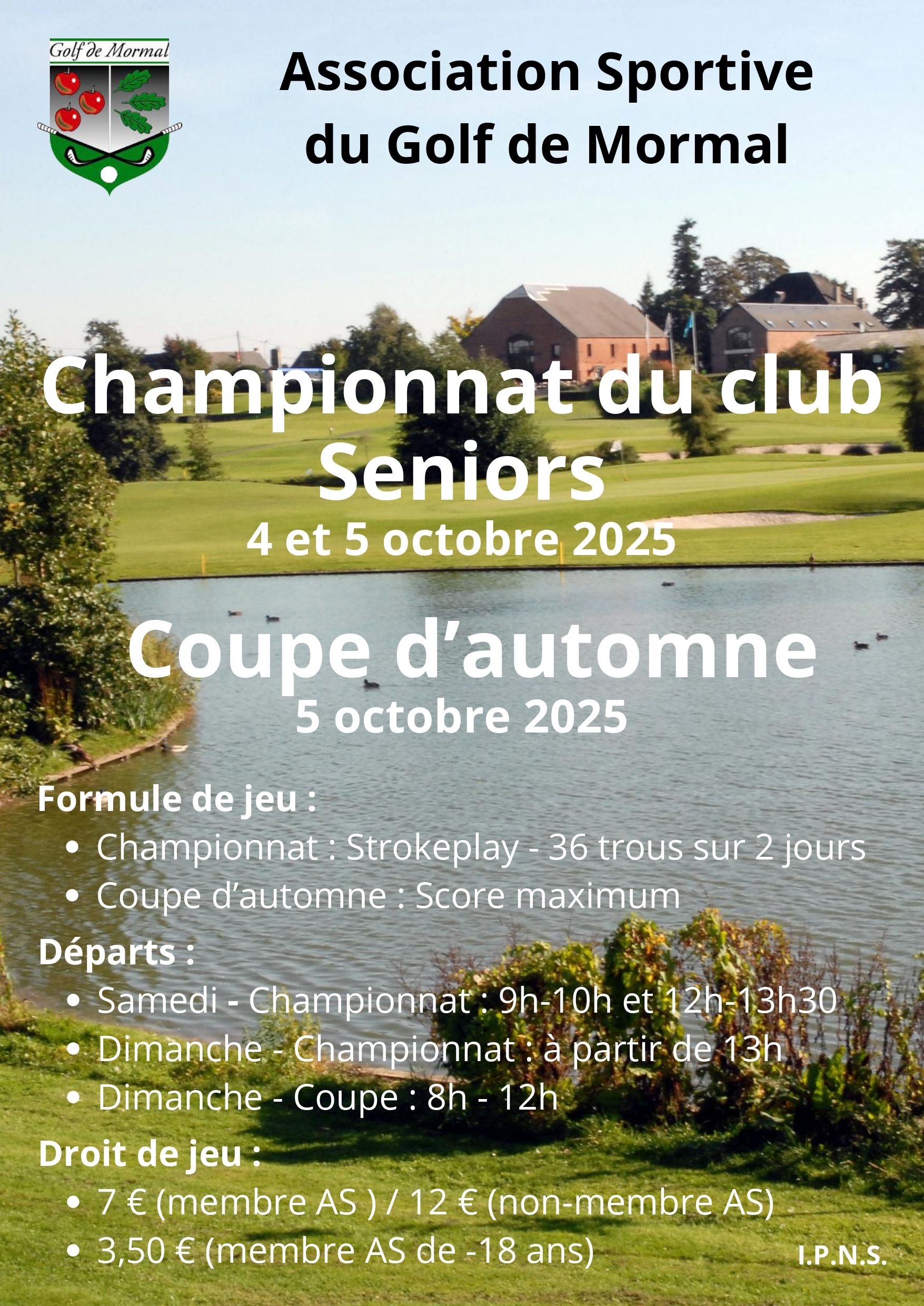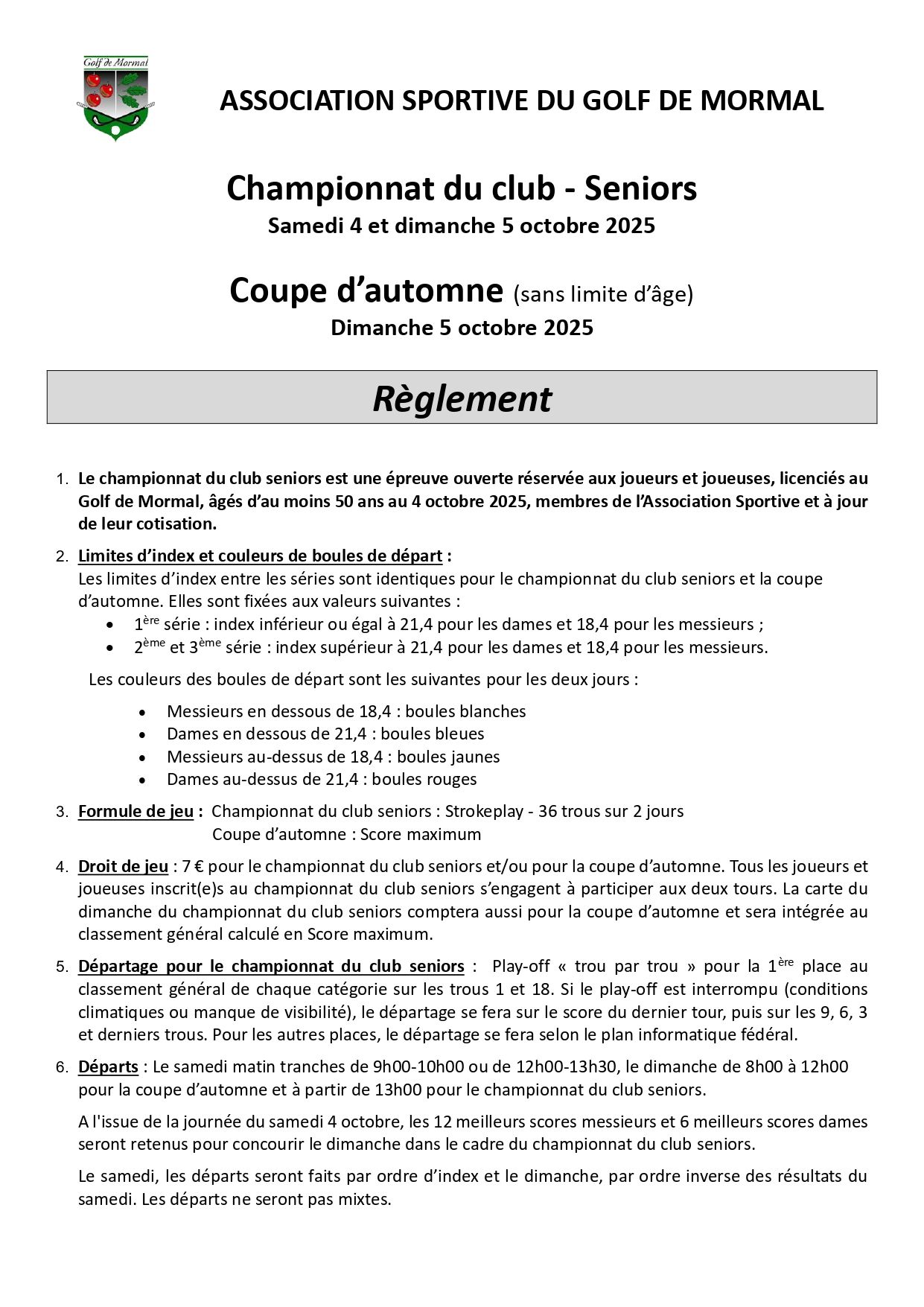 Lors du 1er Tour du Championnat du Club Seniors du samedi 04 octobre, les départs auront lieu :